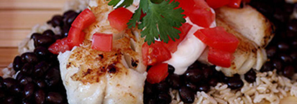 These bite-size tomatoes are filled with briny olives and salty Feta cheese. Great for bar menus or catered hors d’oeuvres. Fish with Black Beans