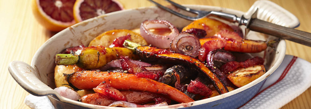 Charred to give these mild peppers smoky, sweet notes, this shareable appetizer is tossed with Japanese furikake and crispy puffed… Blood Orange and Maple Roasted Winter Vegetables