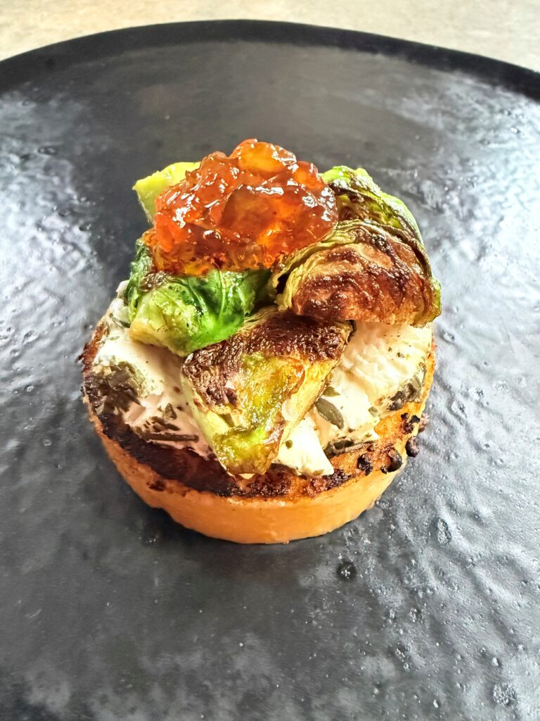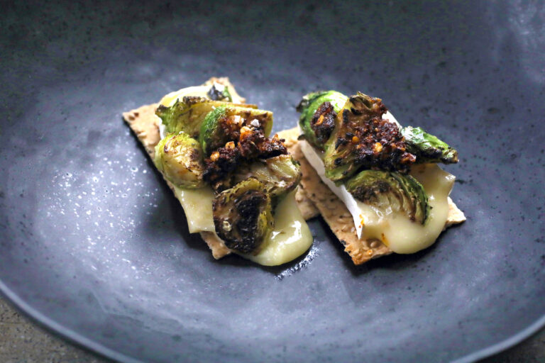 This appetizer has all the craveable components: crunchy crackers, earthy Brussels sprouts, and creamy cheese with a spicy topper. This simple, easy-to-make recipe is ideal for bar, happy hour, and appetizer menus.