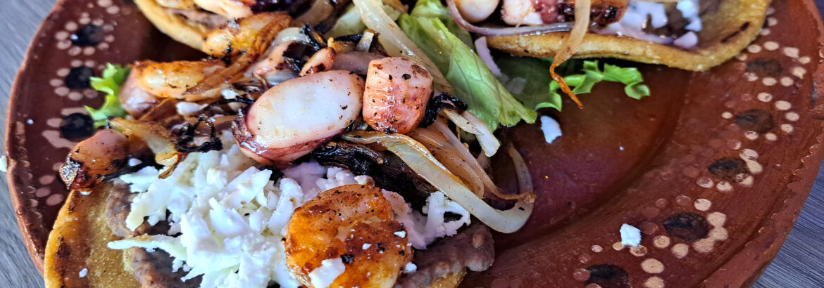 - Tlacoyos, tlayudas, and huraches made with blue corn masa are piled with ingredients like black beans, mushrooms, nopales, zucchini, radishes, and a variety of chile-forward salsas.