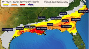 The storm continues to carve a path of snow and ice across southern states from southeast Texas, much of Louisiana, and into Mississippi, Alabama, and Georgia. Seaports and airport closures are occurring in Texas today and freeways are slow/closed due to historical snowfall totals in some locations, restricting the flow of produce commodities.