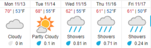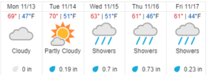 - Forecast calls for rain starting Tuesday, November 14 through Saturday, November 18